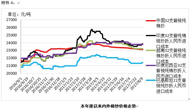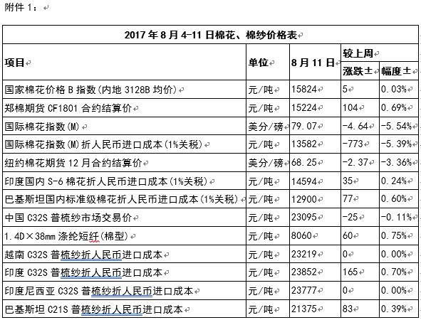 附件1:2017年8月4-11日棉花、棉紗價(jià)格表
