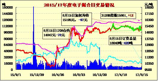 8月15日電子撮合交易成交量減少,合同均價(jià)多數(shù)收跌,成交積極合約主要集中于中遠(yuǎn)期合同,MA1711成交量最大,為2700噸;訂貨量減少,其中MA1712減少最多,為430噸;合同均價(jià)多數(shù)收跌。
