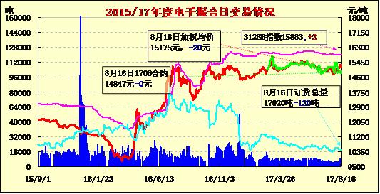 8月16日電子撮合交易成交量減少,合同均價(jià)多數(shù)收跌,成交積極合約主要集中于中遠(yuǎn)期合同,MA1801成交量最大,為2280噸;訂貨量減少,其中MA1801減少最多,為340噸;合同均價(jià)多數(shù)收跌。