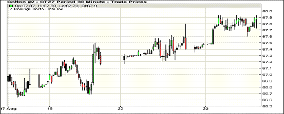 周二紐約期棉連續(xù)第四個交易日收漲,成交保持低迷;1712合約收于67.81美分/磅,漲25點;1803合約收于67.46美分/磅,漲16點。當日主力合約低開但立即走高,最高價接近68美分,合約在后半個交易日回落,但最終仍收于當日震蕩區(qū)間高位。