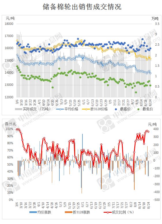 2017年3月6日至8月24日,儲備棉輪出累計(jì)成交251.29萬噸,成交率69.00%。