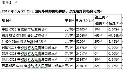 附件2:2017年8月21-25日國內(nèi)外棉紗、滌短價格變化表