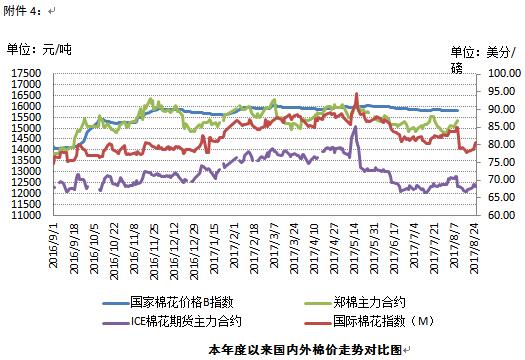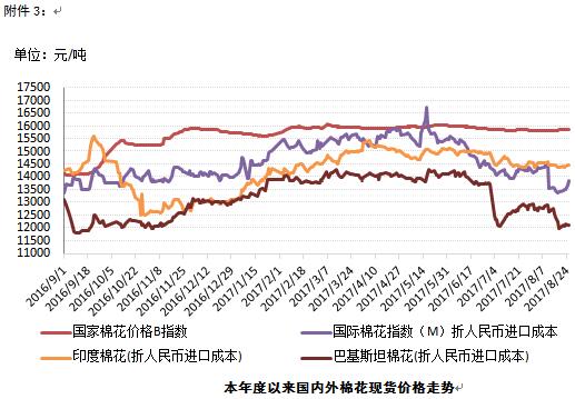 儲備棉競拍熱情高漲,繼續(xù)推動國內(nèi)棉價小幅上漲。8月21-25日,儲備棉輪出掛牌量14.8萬噸,實際成交量14.4萬噸,較上周增加1.47萬噸,成交率97.3%,較上周擴大10個百分點,成交均價14044元/噸,較上周下跌47.2元/噸,折3128級價格15214元/噸,較上周下跌87.4元/噸。其中,地產(chǎn)棉成交率96.64%,較上周擴大12.8個百分點。8月25日,代表內(nèi)地標準級皮棉銷售均價的國家棉花價格B指數(shù)15860元/噸,較上周上漲9元/噸,漲幅0.06%;鄭州棉花期貨CF1801合約結(jié)算價15280元/噸,較上周上漲40元/噸,漲幅0.26%。