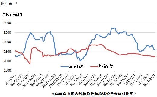 國內(nèi)棉價上漲幅度不大。7月全國規(guī)模以上工業(yè)企業(yè)利潤同比增長16.5%,較6月回落2.6個百分點,產(chǎn)品出廠價格和原料購進價格漲幅差有所收窄?;久嫔?,本周國內(nèi)棉花開始零星采摘,個別企業(yè)已開秤收購,河北邢臺棉企開秤收購價在3.15-3.20元/斤,折皮棉價格約在13553-13827元/噸之間;湖北武漢開秤收購價3.2元/斤,折皮棉價格在13827元/噸左右。據(jù)市場收購情況反饋,今年籽棉開秤價低于預期。目前大部分主產(chǎn)區(qū)棉花長勢正常,南疆少數(shù)地區(qū)遭遇冰雹降雨天氣,對棉花影響有限。近期受中央環(huán)保督察組已入駐各省影響,棉紗銷售剛剛恢復的熱情受到一定程度的壓制,下游純棉坯布交易量仍相對有限,棉價上漲動力不足。距離新花上市時日不多,后期儲備棉大量成交對新棉需求迫切性有所緩沖,另外,紡織品市場下游的消費狀況都將對棉價產(chǎn)生影響。