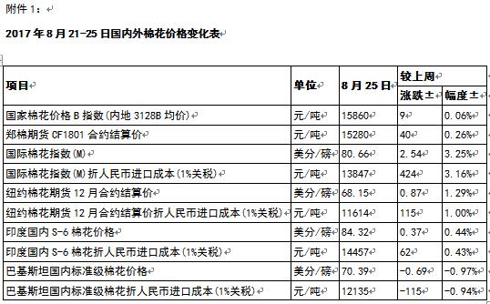 附件1:2017年8月21-25日國內(nèi)外棉花價格變化表