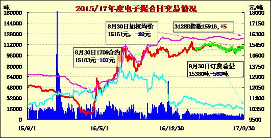 8月30日電子撮合交易成交量增加,合同均價(jià)全部收跌,成交積極合約主要集中于中遠(yuǎn)期合同,MA1801成交量最大,為1560噸;訂貨量減少,其中MA1711減少最多,為840噸;合同均價(jià)全部收跌。據(jù)了解,新年度新疆棉花開(kāi)始零星收購(gòu),托克遜部分軋花廠籽棉收購(gòu)價(jià)在6.5-6.8元/公斤,與去年持平,但是收購(gòu)量還不大,僅是初期。哈密地區(qū)尚未開(kāi)始收購(gòu),預(yù)計(jì)在9月下旬開(kāi)始收購(gòu)籽棉。北疆奎屯地區(qū)也有兩家軋花廠在田間地頭收購(gòu)少量手摘棉,目前已收購(gòu)100多噸,收購(gòu)價(jià)6.8-7.0元/公斤左右,其中已經(jīng)一家軋花廠開(kāi)始準(zhǔn)備加工,并且有了銷(xiāo)售訂單,價(jià)格大概16500元/噸左右。
