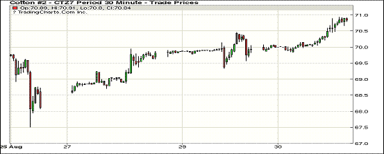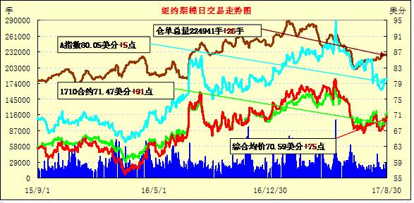 周三紐約期棉繼續(xù)上漲,主力合約沖上70美分;1712合約收于70.85美分/磅,漲87點(diǎn);1803合約收于69.98美分/磅,漲60點(diǎn)。當(dāng)日主力合約沖高,回落后依然保持在110點(diǎn)波動(dòng)范圍頂部,主力合約在連續(xù)三個(gè)交易日上漲270點(diǎn)。目前颶風(fēng)“哈維”在德克薩斯造成的損失還無法統(tǒng)計(jì),但周三“哈維”再次登陸路易斯安那海岸,但已減弱為熱帶風(fēng)暴,預(yù)計(jì)給三角洲棉區(qū)帶來大量降水。