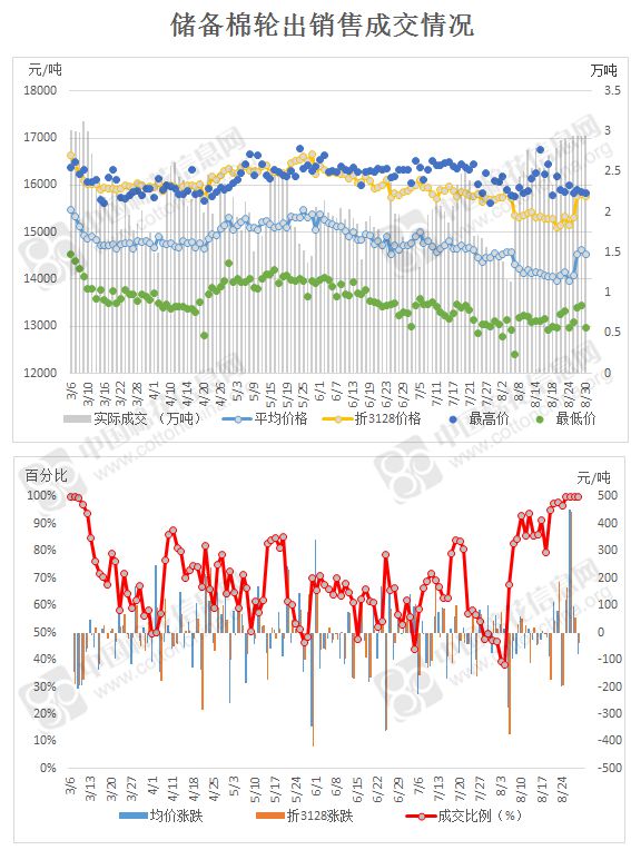 2017年3月6日至8月30日,儲備棉輪出累計成交263萬噸,成交率70.20%。