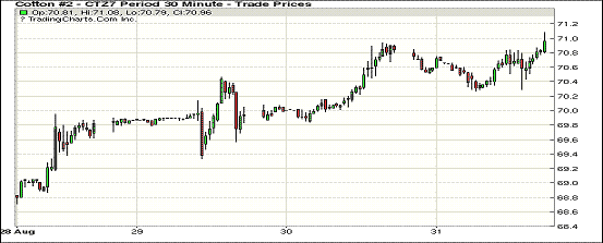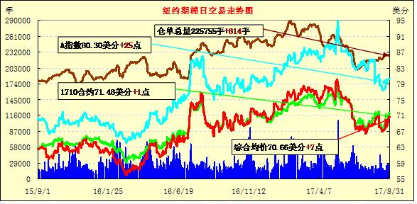 周四紐約期棉繼續(xù)微幅上漲,主力合約收于8月9日以來最高;1712合約收于70.93美分/磅,漲8點;1803合約收于70.11美分/磅,漲13點。當日主力合約主要呈現(xiàn)弱勢,震蕩區(qū)間較前一日擴大,收盤前合約走強并最終收高。1712合約在連續(xù)4個交易日內(nèi)上漲278點。颶風帶來的影響依然廣泛受到關注,據(jù)美國當?shù)匾恍┧饺藱C構報告,新花損失在30萬包以上,其中還不包括已經(jīng)加工完成,并存放在庫的皮棉,其也可能受到影響。