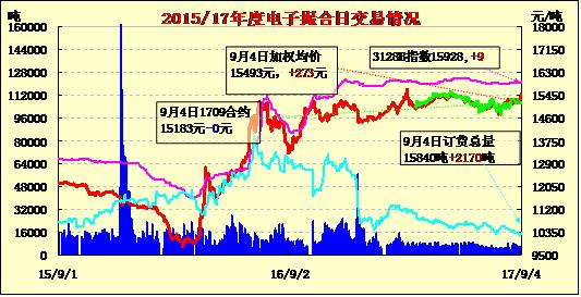 9月4日電子撮合交易成交量增加,合同均價全部收漲,成交積極合約主要集中于中遠期合同,MA1801成交量最大,為1100噸;訂貨量增加,其中MA1801增加最多,為920噸;合同均價全部收漲。