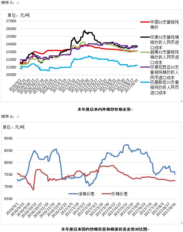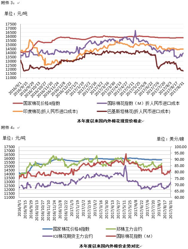 新花收購(gòu)價(jià)尚未明朗,國(guó)內(nèi)棉價(jià)基本平穩(wěn)。8月28日-9月1日儲(chǔ)備棉輪出掛牌量14.6萬(wàn)噸,成交量14.5萬(wàn)噸,成交率99.27%,其中新疆棉成交8.5萬(wàn)噸,地產(chǎn)棉成交6萬(wàn)噸;成交均價(jià)14506元/噸,較上周上漲462元/噸。9月1日代表內(nèi)地標(biāo)準(zhǔn)級(jí)皮棉銷售均價(jià)的國(guó)家棉花價(jià)格B指數(shù)15853元/噸,較上周下跌7元/噸,跌幅0.04%;鄭州棉花期貨CF1801合約結(jié)算價(jià)15315元/噸,較上周上漲35元/噸,漲幅0.23%。
