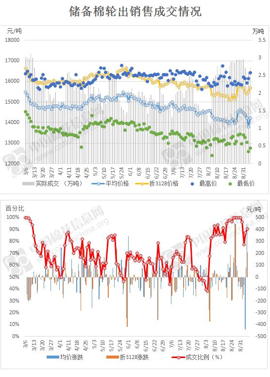 9月6日儲備棉輪出銷售資源30036.75噸,實際成交27196.281噸,成交率90.54%。成交平均價格14234元/噸(較前一日價格漲444/噸);折3128價格15698元/噸(較前一日價格漲205元/噸)。