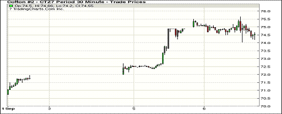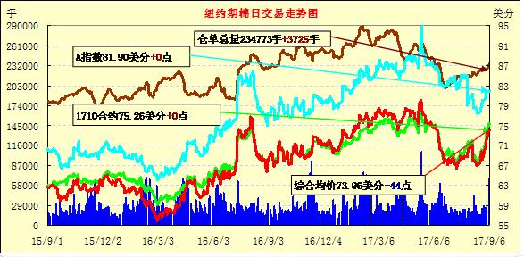 周三紐約期棉在大漲后稍顯疲軟,合約價(jià)小幅下跌,成交量收縮;1712合約收于74.50美分/磅,跌38點(diǎn);1803合約收于73.24美分/磅,跌37點(diǎn)。當(dāng)日市場缺乏對颶風(fēng)Irma最新動(dòng)態(tài)消息,紐約期棉呈調(diào)整走勢,主力合約缺乏明顯方向,合約在161點(diǎn)震蕩區(qū)內(nèi)減起伏并最終小幅收跌,成為近7個(gè)交易日來首次下跌。目前颶風(fēng)Irma已成為大西洋有記錄以來最強(qiáng)颶風(fēng)。佛羅里達(dá)南部,三角洲棉區(qū)和德克薩斯東南都可能受到影響。佛州已對南部居民發(fā)布撤離令。