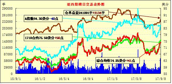 隨著颶風(fēng)的推進(jìn),周五紐約期棉止跌反彈;1712合約收于74.59美分/磅,漲32點(diǎn);1803合約收于73.41美分/磅,漲49點(diǎn)。當(dāng)日主力合約高開(kāi)并在短暫的上漲后遇阻回落,在之后的幾個(gè)小時(shí)內(nèi)買(mǎi)盤(pán)增加,合約價(jià)沖高至75.75美分/磅,收盤(pán)前再次回落但最終收漲。預(yù)計(jì)颶風(fēng)厄瑪將在周六晚到周日凌晨登陸佛羅里達(dá),目前颶風(fēng)已經(jīng)減弱至4級(jí),但依然破壞力驚人。