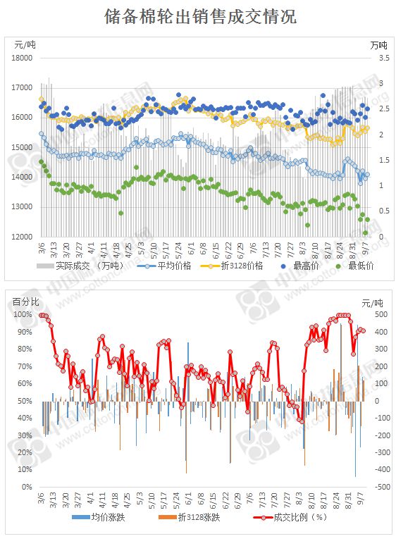 9月8日儲備棉輪出銷售資源30031.183噸,實際成交27246.475噸,成交率90.73%。成交平均價格14109元/噸(較前一日價格漲141元/噸);折3128價格15674元/噸(較前一日價格漲122元/噸)。