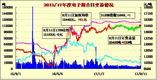 9月11日電子撮合交易成交量增加,合同均價(jià)漲跌互現(xiàn),成交積極合約主要集中于中遠(yuǎn)期合同,MA1801成交量最大,為2600噸;訂貨量增加,其中MA1712增加最多,為410噸;合同均價(jià)漲跌互現(xiàn)。開秤時(shí)間,各地根據(jù)棉花生長(zhǎng)情況有所不同,新州、蔡甸、仙桃等地企業(yè)開秤較早,荊州、黃岡等地企業(yè)開秤相對(duì)晚些。和往年一樣,早期入市收購的仍以200型企業(yè)為主,黃岡某企業(yè)負(fù)責(zé)人介紹,當(dāng)?shù)?00型企業(yè)幾乎沒開秤,200型企業(yè)3.2元/斤收購,及時(shí)加工,銷售價(jià)14200元/噸左右,賺取一定利潤(rùn)加快周轉(zhuǎn)。相比去年,今年400型企業(yè)參與新棉收購數(shù)量將有所增加。某400型企業(yè)已連續(xù)2年沒在本地收購,今年剛開秤收購,開秤第一天就收購了3萬多斤籽棉,該廠負(fù)責(zé)人感慨如再不運(yùn)行,機(jī)器設(shè)備將閑置報(bào)廢,連加工技術(shù)人員都難招了。