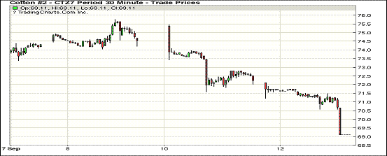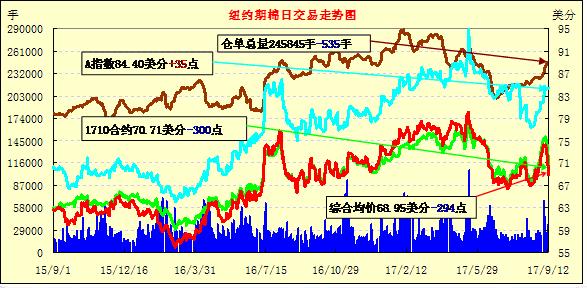 周二美國農(nóng)業(yè)部預測上調(diào)2017/18年度世界產(chǎn)量和期末庫存,紐期主力合約跌停;1712合約收于69.11美分/磅,跌300點;1803合約收于68.47美分/磅,跌300點。當日主力合約在USDA預測發(fā)布后暴跌,并且在跌停后保持,收盤時為8月25日以來最低價,兩個交易日內(nèi)主力合約累計跌548點。9月USDA預測上調(diào)了大部分產(chǎn)棉國產(chǎn)量,其中美國,印度和巴西上調(diào)幅度較大,世界產(chǎn)量達到2629萬噸,較上月調(diào)增74.9萬噸;世界消費小幅調(diào)增,期末庫存達到2014.7萬噸,調(diào)增53.1萬噸。