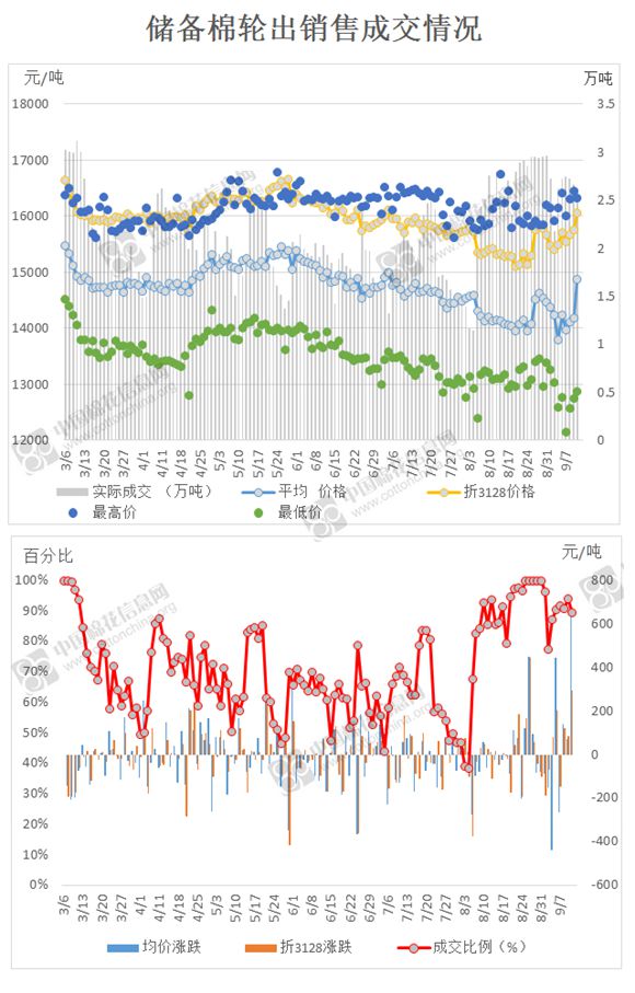 9月12日儲備棉輪出銷售資源28086.5625噸,實際成交25174.3455噸,成交率89.63%。成交平均價格14867元/噸(較前一日價格漲685元/噸);折3128價格16054元/噸(較前一日價格漲296元/噸)。