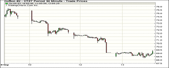 周三紐約期棉止跌,合約漲跌互現(xiàn);1712合約收于69.09美分/磅,跌2點(diǎn);1803合約收于68.60美分/磅,漲13點(diǎn)。在經(jīng)歷了兩天暴跌后,周三主力合約主要呈調(diào)整走勢(shì),合約在一天內(nèi)多起伏,最低至68.31美分/磅,為8月25日以來(lái)最低水平。近來(lái)兩場(chǎng)颶風(fēng)帶來(lái)的損失尚未完成評(píng)估,美國(guó)農(nóng)業(yè)部9月預(yù)測(cè)并不包含颶風(fēng)造成的減產(chǎn),美棉增產(chǎn)幅度預(yù)估未來(lái)可能還將下調(diào),但過(guò)剩局面不變。