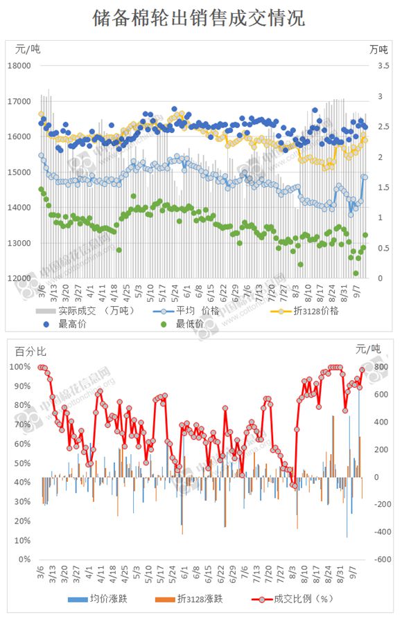 9月13日儲備棉輪出銷售資源27446.4829噸,實(shí)際成交27081.4629噸,成交率98.67%。成交平均價格14858元/噸(較前一日價格跌9元/噸);折3128價格15898元/噸(較前一日價格跌156元/噸)。
