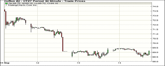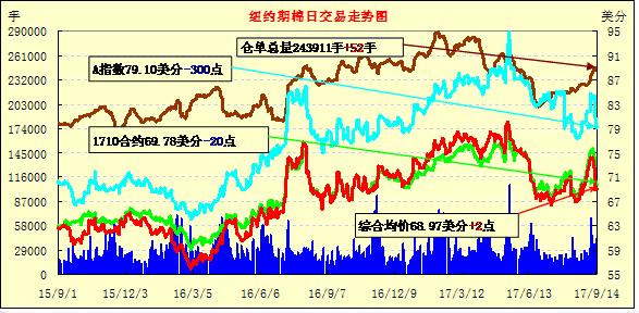 周四紐約期棉保持調(diào)整,合約漲跌互現(xiàn);1712合約收于69.12美分/磅,漲3點(diǎn);1803合約收于68.53美分/磅,跌7點(diǎn)。當(dāng)日主力合約開市后上漲,最高價69.45美分/磅,合約回落后下跌并保持在跌幅區(qū)間,最低價68.43美分/磅,收盤前再次上漲,最終微幅收漲。因本月USDA上調(diào)本年度美棉出口量,至9月7日美棉累計簽約達(dá)到49%,上年度同期為34%,累計簽約量高出去年同期204.6萬包。