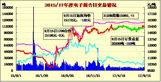 9月15日電子撮合交易成交量減少,合同均價(jià)全部收跌,成交積極合約主要集中于中遠(yuǎn)期合同,MA1801成交量最大,為2550噸;訂貨量減少,其中MA1801增加最多,為950噸;合同均價(jià)全部收跌。