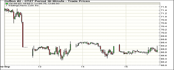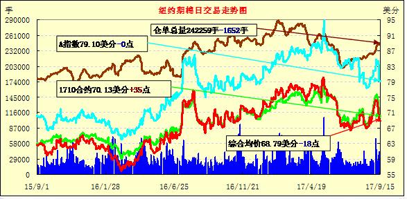 15日紐約期棉小幅盤整后微跌收盤,12月合約結(jié)算價69.07美分/磅,跌5點,1803月合約67.99美分,跌54點。12/3月價差106點。當(dāng)日12月合約小幅高開,交易中期跌落至69美分以下,交易后期有少量買盤支撐反彈,終以微跌收盤;3月合約小幅高開后盤中走弱,終收于68美分以下。12/3月合約價差擴(kuò)大至1美分以上,顯示出近強(qiáng)遠(yuǎn)弱的格局,強(qiáng)勢的美棉出口對近月合約形成支持,而除中國以外的國際市場庫存居高,對遠(yuǎn)月形成壓力。