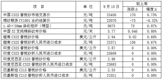 國(guó)內(nèi)棉花市場(chǎng)仍處青黃不接階段,現(xiàn)貨價(jià)格繼續(xù)小幅上漲,鄭棉期貨價(jià)格跟隨ICE期棉價(jià)格回落。9月11-15日,儲(chǔ)備棉輪出掛牌量13.7萬噸,成交量12.5萬噸,成交率91.1%,較上周上升3.62個(gè)百分點(diǎn),成交均價(jià)14651元/噸,較上周上漲585元/噸,漲幅4.16%。9月15日,代表內(nèi)地標(biāo)準(zhǔn)級(jí)皮棉銷售均價(jià)的國(guó)家棉花價(jià)格B指數(shù)15884元/噸,較上周上漲19元/噸,漲幅0.12%;鄭州棉花期貨CF1801合約結(jié)算價(jià)15360元/噸,較上周下跌305元/噸,跌幅1.95%。