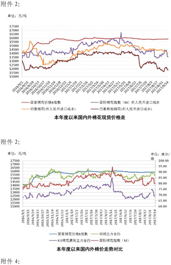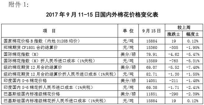 附件1:2017年9月11-15日國(guó)內(nèi)外棉花價(jià)格變化表