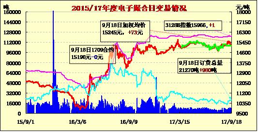 9月18日電子撮合交易成交量減少,合同均價(jià)全部收漲,成交積極合約主要集中于中遠(yuǎn)期合同,MA1712成交量最大,為2300噸;訂貨量增加,其中MA1801增加最多,為590噸;合同均價(jià)全部收漲。近期,河北棉花市場(chǎng)現(xiàn)貨價(jià)格繼續(xù)小漲。首先,籽棉收購(gòu)價(jià)格上漲。截至15日,已開秤的200型小廠的籽棉收購(gòu)價(jià)在3.3-3.45元/斤(衣分39%,回潮率15%以下),較本月初上漲0.2元/斤。據(jù)了解,衡水棉區(qū)已開秤的200型小廠在10-13家之間,且都已放量收購(gòu);個(gè)別400型大廠的收購(gòu)價(jià)格在3.5元/斤,大廠對(duì)質(zhì)量普遍把關(guān)較嚴(yán)格,一般每天收購(gòu)1-2萬斤,總體價(jià)格水平較相比之前有所提升。