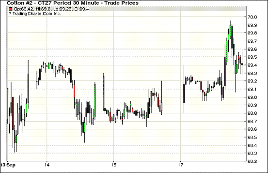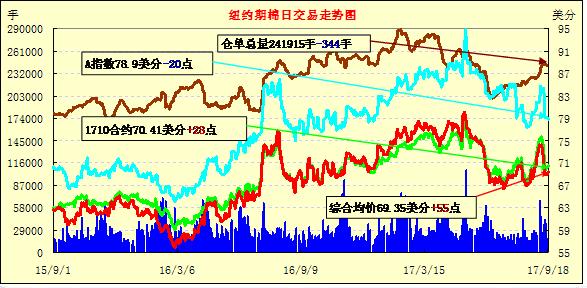 在連續(xù)多日下跌后,周一紐約期棉上漲;1712合約收于69.50美分/磅,漲43點(diǎn);1803合約收于68.90美分/磅,漲91點(diǎn)。當(dāng)日主力合約早盤小幅下挫后微幅震蕩,盤中買盤活躍上漲,收盤前合約從高位下跌,但依然處于當(dāng)日交投區(qū)間上半部。近日現(xiàn)貨詢盤有限,貿(mào)易商保持謹(jǐn)慎,目前12/3月價(jià)差在60點(diǎn)。市場關(guān)注官方預(yù)測的颶風(fēng)Irma和哈維造成的損失,另外5級颶風(fēng)瑪利亞已經(jīng)生成并且北上。