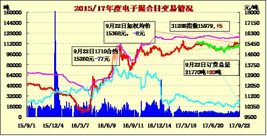 9月22日電子撮合交易成交量減少,合同均價(jià)多數(shù)收跌,成交積極合約主要集中于中遠(yuǎn)期合同,MA1801成交量最大,為2210噸;訂貨量增加,其中MA1803增加最多,為650噸;合同均價(jià)多數(shù)收跌。21日,河南南陽(yáng)棉企繼續(xù)保持在十到二十噸的收購(gòu)量,籽棉主要是從湖北松滋等地收購(gòu)。當(dāng)前,南陽(yáng)棉農(nóng)采摘籽棉量較小,還沒(méi)有大量采摘,預(yù)計(jì)九月底將開(kāi)始大量上市,到時(shí)棉農(nóng)將根據(jù)實(shí)際情況和籽棉價(jià)格進(jìn)行出售。