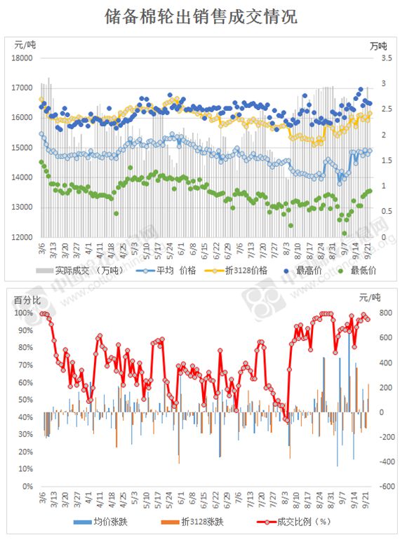 9月22日儲(chǔ)備棉輪出銷售資源26811.6746噸,實(shí)際成交25889.0334噸,成交率96.56%。成交平均價(jià)格14914元/噸(較前一日價(jià)格漲114元/噸);折3128價(jià)格16155元/噸(較前一日價(jià)格漲230元/噸)。
