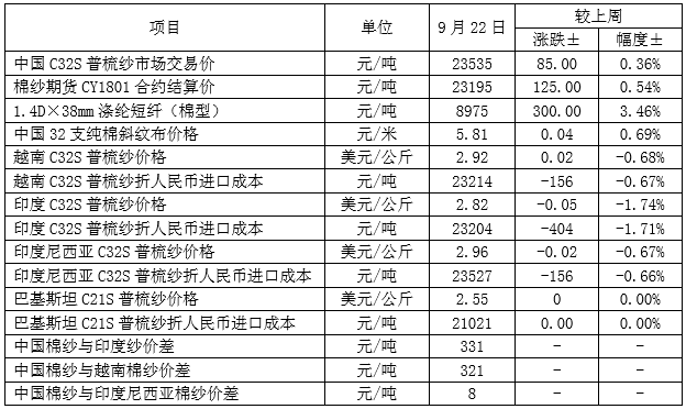 市場對美棉產(chǎn)量受損的擔憂減輕,全球棉花豐產(chǎn)的壓力使國際棉價弱勢運行。巴基斯坦國內(nèi)棉花需求恢復(fù),棉價相對堅挺。9月22日,紐約棉花期貨12月合約結(jié)算價68.46美分/磅,較上周下跌0.61美分/磅,跌幅0.88%,代表進口棉中國主港到岸均價的國際棉花指數(shù)(M)為79.14美分/磅,折人民幣進口成本13462元/噸(1%關(guān)稅,海關(guān)計征匯率,下同),較上周下跌127元/噸,跌幅0.94%,低于國內(nèi)市場2438元/噸,內(nèi)外棉價差較上周擴大143元/噸。印度國內(nèi)S-6棉花價格79.66美分/磅,折人民幣進口成本13548元/噸,較上周下跌317元/噸,跌幅2.29%,低于國內(nèi)棉花價格2352元/噸,價差較上周擴大333元/噸;巴基斯坦國內(nèi)標準級棉花價格69.68美分/磅,折人民幣進口成本11901元/噸,較上周上漲139元/噸,漲幅1.18%,低于國內(nèi)市場3999元/噸,價差較上周縮小123元/噸。