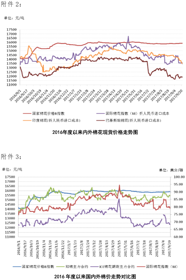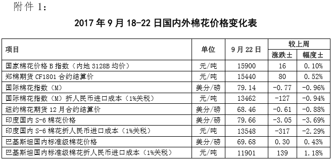 附件1:2017年9月18-22日國內(nèi)外棉花價格變化表