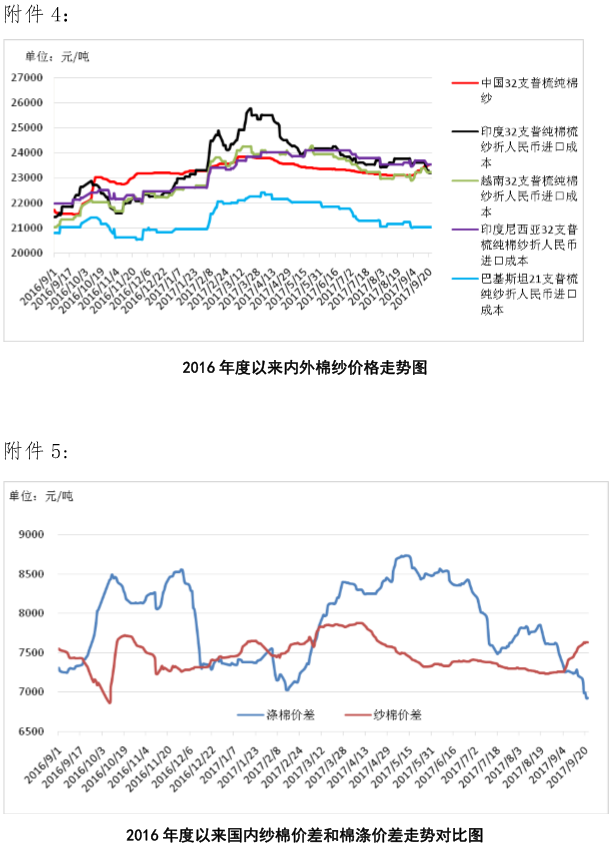國內(nèi)棉價依舊平穩(wěn)。本周受美聯(lián)儲宣布啟動縮表,標普下調(diào)中國信用等級等影響,人民幣面臨貶值壓力,9月22日人民幣兌美元中間價6.5861,較上周五貶值438個基點。國慶節(jié)前在銀行季末考核壓力等因素的影響下,銀行間市場的利率水平較前期收緊,市場資金面相對緊張?;久嫔?,本周全國新棉采摘交售逐漸展開,籽棉收購價格差異較大,購銷市場仍顯平靜。目前北疆手采棉收購價格在7.5元/公斤左右,折皮棉成本價格16800元/噸左右;機采棉在6.5元/公斤左右,折皮棉成本價格在14500元/噸左右;南疆手采棉收購價格在7.1-7.2元/公斤,折皮棉價格在16000元/噸左右;內(nèi)地籽棉收購報價在3.5-3.6元/斤左右,折皮棉成本價格在15300-15500元/噸,目前新棉收購仍處于市場試探和和成本測算階段。下游棉紗庫存呈現(xiàn)下降趨勢,紗產(chǎn)銷率止跌企穩(wěn),布訂單略有小增,庫存仍然維持偏高水平。后期隨著紡織季節(jié)性旺季的到來,預(yù)計需求將穩(wěn)步增長,并對原料有所支撐。下周國慶長假前的最后一周,預(yù)計國內(nèi)棉花市場依舊維持相對平穩(wěn)狀態(tài)。