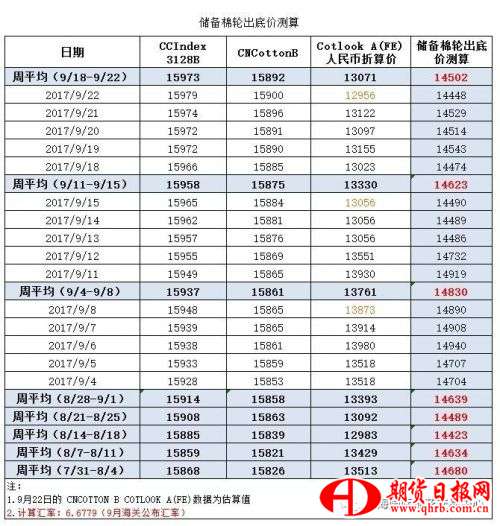 外盤市場方面,自8月下旬以來ICE期棉基本隨颶風而動。在哈維、艾爾瑪掃過后,瑪麗亞又成為影響近兩周市場的關鍵因素。本周隨著瑪麗亞對棉花造成的潛在破壞的擔憂減退,ICE期棉主力合約周四一度大跌1.52%,周五亞洲電子盤在探底68.11美分/磅后暫時趨穩(wěn),但已回歸至哈維來臨前的位置。ICE期棉的頹勢對CotlookA指數(shù)的影響立竿見影,本周CotlookA均價79.36美分/磅,折人民幣13071元/噸,較上周下跌259元,外盤再次成為“牽動”拋儲底價變化的關鍵因素。