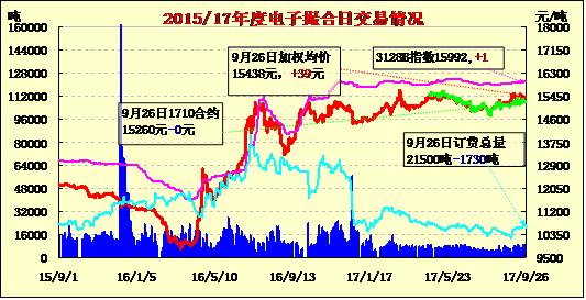 9月26日電子撮合交易成交量減少,合同均價全部收漲,成交積極合約主要集中于中遠期合同,MA1802成交量最大,為2090噸;訂貨量減少,其中MA1802增加最多,為980噸;合同均價多數(shù)上漲?,F(xiàn)貨市場穩(wěn)定,臨近假日商家清庫等待新棉為主,成交零星,一商家內(nèi)地庫手摘疆棉3128級強力26-27倉單棉銷售報價在16400-16500元/噸。
