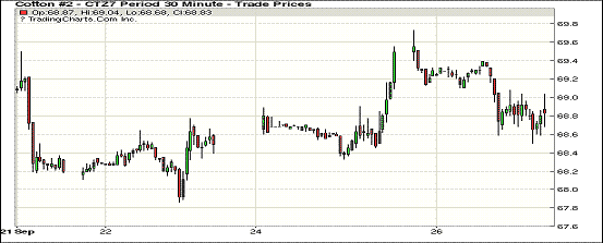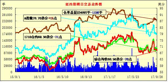 周二美元指數(shù)上漲,紐約期棉再次下跌,成交量減少;1712合約收于68.75美分/磅,跌71點;1803合約收于67.89美分/磅,跌65點。當日12月合約周二開盤后上漲,并且很快觸及當日最高價69.73美分/磅。合約離開最高價后下跌走低,在當日之后的交易中保持在跌幅區(qū)間。近期對德克薩斯棉區(qū)不良天氣的擔憂引起關(guān)注,目前處于采收階段的棉區(qū)降溫降雨,給作物帶來不利影響。