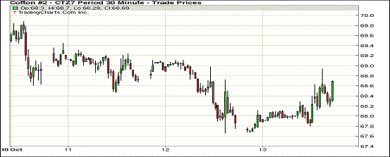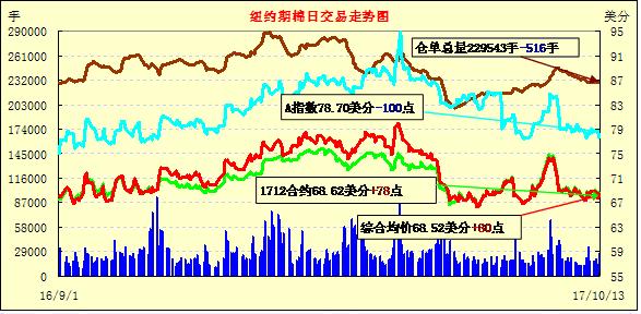 本周最后一個交易日,紐約期棉小幅反彈,回補前一日大部分跌幅;1712合約收于68.62美分/磅,漲78點;1803合約收于68.16美分/磅,漲79點。當日主力合約先跌后漲,1712合約在開盤后和盤中經(jīng)歷兩次賣出下跌并反彈,但最終未能突破69美分,主力合約一周內(nèi)跌22點。上周本年度美國陸地棉簽約3.5萬噸,裝運2.7萬噸,均較近4周平均簽約量減少,累計簽約量達到預期出口量的56%,裝運達到11%。