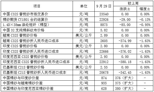 三、國(guó)內(nèi)外棉紗價(jià)格平穩(wěn) 滌綸短纖價(jià)格弱勢(shì)