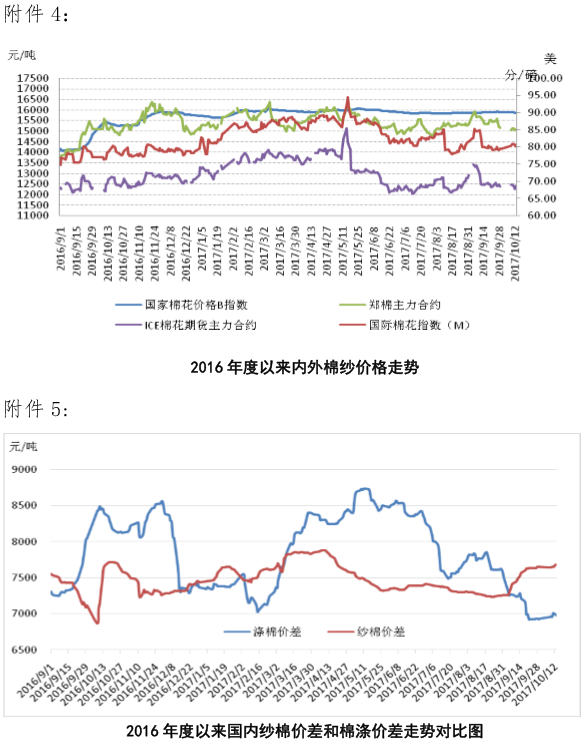 國(guó)內(nèi)棉價(jià)趨于穩(wěn)定。國(guó)際貨幣基金組織(IMF)將中國(guó)今明兩年增速預(yù)測(cè)0.1個(gè)百分點(diǎn)至6.8%和6.5%,國(guó)家統(tǒng)計(jì)局預(yù)計(jì)今年可實(shí)現(xiàn)經(jīng)濟(jì)6.5%增長(zhǎng)目標(biāo)。人民幣升值因素使得2017年我國(guó)進(jìn)口增速大幅超過(guò)出口,9月出口回升明顯要弱于預(yù)期,8月紡織服裝出口同比增速開(kāi)始出現(xiàn)負(fù)增長(zhǎng)。9月30日央行公布“定向降準(zhǔn)”政策、及10月13日超額續(xù)作中期借貸便利(MLF),均反映出央行對(duì)于貨幣政策的結(jié)構(gòu)性?xún)?yōu)先,流動(dòng)性整體不放松,近期人民幣匯率逐漸企穩(wěn)雙向波動(dòng),出口壓力可能有所減輕。基本面上,儲(chǔ)備棉輪出結(jié)束后,紡企原料庫(kù)存充足,新棉開(kāi)秤價(jià)較高,準(zhǔn)備采購(gòu)原料的企業(yè)減少,新棉采摘交售進(jìn)度較去年也有所放緩,據(jù)國(guó)家棉花市場(chǎng)監(jiān)測(cè)系統(tǒng)調(diào)查數(shù)據(jù)顯示,截至2017年10月13日全國(guó)新棉采摘進(jìn)度為44.5%,同比下降3.9個(gè)百分點(diǎn),新棉加工率和銷(xiāo)售率較去年同期均有不同程度下降。近期棉籽價(jià)格止跌企穩(wěn),新棉購(gòu)銷(xiāo)價(jià)格趨于穩(wěn)定,下游棉紗旺季特征顯現(xiàn),高支紗利潤(rùn)增長(zhǎng),布產(chǎn)銷(xiāo)形勢(shì)開(kāi)始回升,高質(zhì)量棉花需求將逐漸增加,預(yù)計(jì)10月中下旬,籽棉購(gòu)銷(xiāo)工作將全面展開(kāi),國(guó)內(nèi)棉花價(jià)格或?qū)⒕S持平穩(wěn)走勢(shì)。