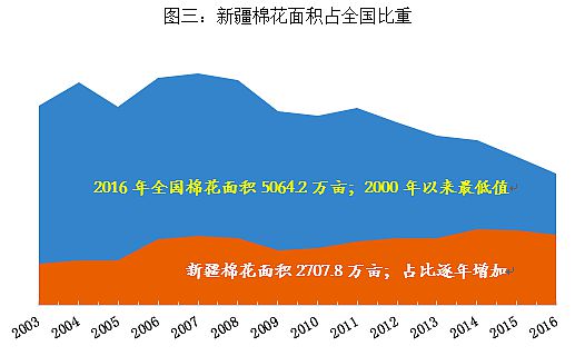 通過政策的導向和帶動作用,我國棉花生產(chǎn)進一步向新疆優(yōu)勢產(chǎn)區(qū)集中,新疆產(chǎn)量占比由5年前的40%上升至70-80%,棉花生產(chǎn)比較優(yōu)勢充分發(fā)揮;同時新疆棉花種植結(jié)構(gòu)得到調(diào)整,次宜棉區(qū)退出棉花生產(chǎn),實現(xiàn)種植結(jié)構(gòu)向調(diào)好、調(diào)順、調(diào)優(yōu)轉(zhuǎn)變。