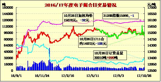 26日電子撮合交易市場現(xiàn)貨掛牌交易成交量減少,整體合同均價(jià)全部收跌,其中近月MA1711合同跌幅最大,均價(jià)下跌106元/噸,成交量較小,為190噸;活躍交投的合同多集中于遠(yuǎn)期合同,訂貨量總量有所增加,其中MA1804訂貨量最大,為860噸。新疆棉加工量截至10月24日為142萬噸,其中,兵團(tuán)加工量51萬噸,地方加工量91萬噸。近期新疆棉皮棉銷售報(bào)價(jià)多數(shù)在15600-16300元/噸,雙29棉花新疆現(xiàn)貨報(bào)價(jià)16200元/噸,銷售情況一般。近期河北省各地棉籽止跌企穩(wěn),局部價(jià)格小幅回漲。鄭棉期貨CF1701主力合約小幅度收跌,收于15025元/噸。