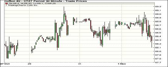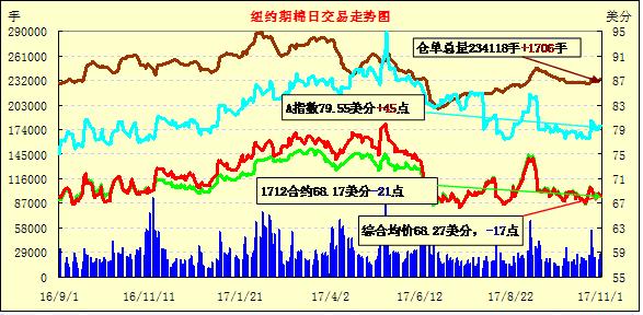 周三紐約期棉繼續(xù)下跌,成交量放大;1712合約收于68.17美分/磅,跌21點;1803合約收于68.15美分/磅,跌19點。當日主力合約先漲后跌,在觸及最高價69.05美分/磅后回落并在之后的交易中保持弱勢,最終收于當日交投區(qū)間底部。因面臨北半球新花上市,紐約期棉承壓較大,本周CCI已開啟收購,收購首日在古吉拉特邦成交籽棉1.2萬公擔。