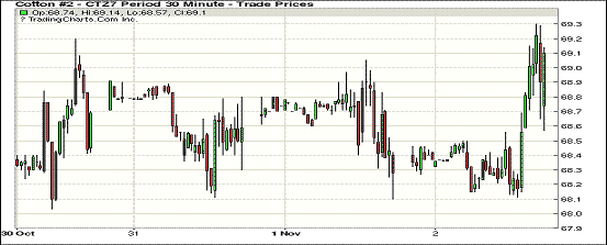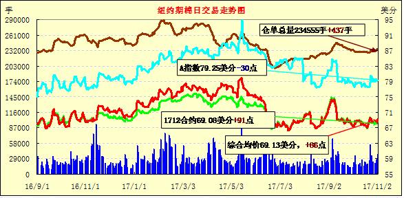 周四紐約期棉大漲,登記庫存大幅增加;1712合約收于69.08美分/磅,漲91點,1803合約收于68.97美分/磅,漲82點。當(dāng)日主力合約在微幅調(diào)整后上漲,但未能沖破70美分/磅,最終漲幅僅1%。12/3月價差11點。至10.26一周,美國陸地棉簽約21.0萬包,裝運8.7萬包,簽約量達(dá)到預(yù)期出口量的62%,裝運進(jìn)度13%。