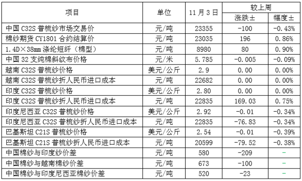 美棉整體出口簽約良好,及印度棉花最低收購(gòu)政策持續(xù)影響下,國(guó)際棉價(jià)小幅上漲。11月3日紐約棉花期貨12月合約結(jié)算價(jià)68.72美分/磅,較上周上漲0.44美分/磅,漲幅0.64%;代表進(jìn)口棉中國(guó)主港到岸均價(jià)的國(guó)際棉花指數(shù)(M)為80.92美分/磅,較上周上漲0.5美分/磅,漲幅0.62%,折人民幣進(jìn)口成本13598元/噸(1%關(guān)稅,海關(guān)計(jì)征匯率,下同),較上周上漲145元/噸,漲幅1.08%,低于國(guó)內(nèi)市場(chǎng)2277元/噸,內(nèi)外棉價(jià)差較上周縮小140元/噸。近期印度棉紗內(nèi)外需求減弱,庫(kù)存開(kāi)始積壓,及軋花廠資金短缺,新棉收購(gòu)受到影響,印度棉價(jià)有所下跌。(詳見(jiàn)附件1)。