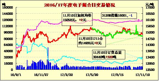 10日電子撮合交易成交量減少,整體合同均價多數(shù)收漲,基本所有合同上漲幅度都較小,其中MA804成交量較大,為2020噸;活躍交投的合同多集中于遠期合同,整體訂貨量總量有所增加,其中MA1801訂貨量最大,累計訂貨量為8100噸。截止到2017年11月9日24點,新疆地區(qū)皮棉加工總量232.46萬噸,其中,兵團加工量80.16萬噸,地方加工量152.30萬噸,日增量6.05萬噸。枝江、荊州、潛江等地大廠多收購22級以上籽棉,便于皮棉銷售,收購量較少,皮棉1227級報價在15000元/噸左右。武漢新洲、東西湖等地小廠較為靈活,高低等級籽棉均有收購,皮棉分級定價,2227級報價多在14100-14200元/噸(凈重帶票)。鄭棉期貨主力合約收紅,收于15190元/噸。