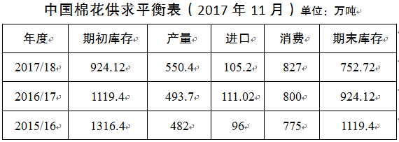 11月上旬發(fā)改委、財政部聯(lián)合發(fā)布公告,決定今年新棉上市期間(目前至明年2月底)原則上不安排輪入,2018年儲備棉輪出銷售將從3月12日開始,截止時間暫定為8月底,每日掛牌銷售數(shù)量暫按3萬噸安排。如一段時期內(nèi)國內(nèi)外市場價格出現(xiàn)明顯快速上漲,儲備棉競價銷售成交率一周有三日以上超過70%,將適當(dāng)加大日掛牌數(shù)量、延長輪出銷售期限,或采取其它措施,保證市場供應(yīng)。