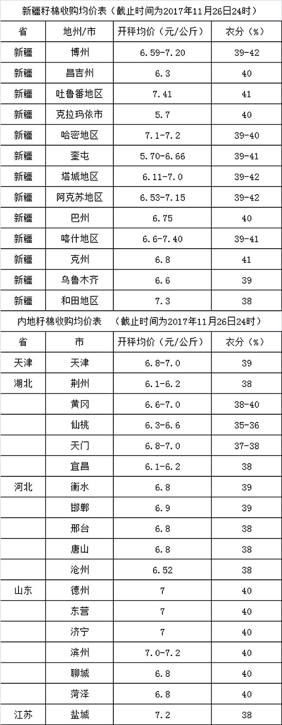 內(nèi)地采摘已近尾聲,因局部地區(qū)陰雨,影響棉花交售進(jìn)度,對(duì)棉花品質(zhì)也有一定影響;棉價(jià)繼續(xù)走低。黃河流域山東和河北等地平均收購(gòu)價(jià)6.87元/公斤,較上周下跌0.16元/公斤。其中山東省皮棉加工成本13700-15500元/噸,目前標(biāo)準(zhǔn)級(jí)皮棉報(bào)價(jià)15100-15200元/噸,較上周下調(diào)200元/噸。長(zhǎng)江流域棉區(qū)陰雨天偏多,棉花的顏色級(jí)、長(zhǎng)度、強(qiáng)力等指標(biāo)均受到明顯影響,因此籽棉收購(gòu)價(jià)低于黃河流域,周均價(jià)6.59元/公斤,較上周下降0.11元/公斤。